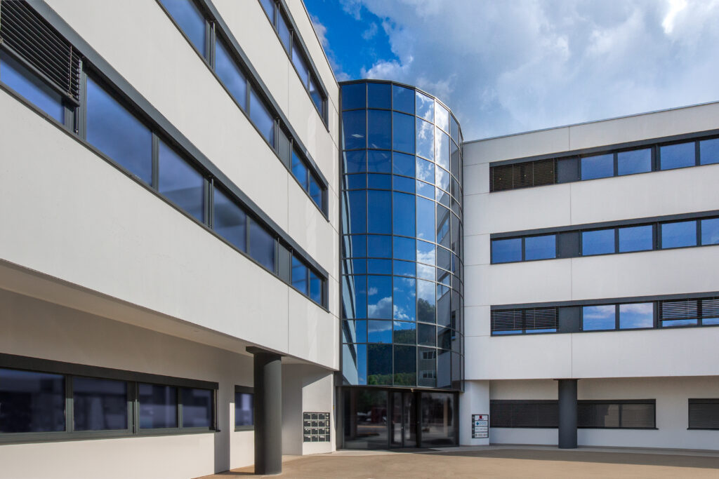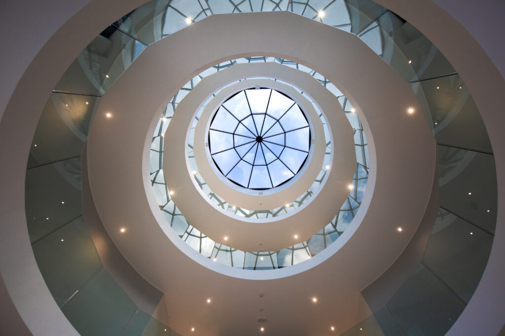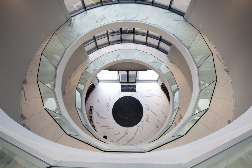Il Centro Alpha rappresenta un’eccellenza architettonica nel panorama degli edifici direzionali del Mendrisiotto. Organizzato attorno a un atrio centrale a pianta circolare, il progetto si distingue per la sua qualità costruttiva e per la precisione geometrica delle forme curve, visibili nella grande scala elicoidale e nella cupola in vetro che illumina naturalmente l’intero corpo centrale.